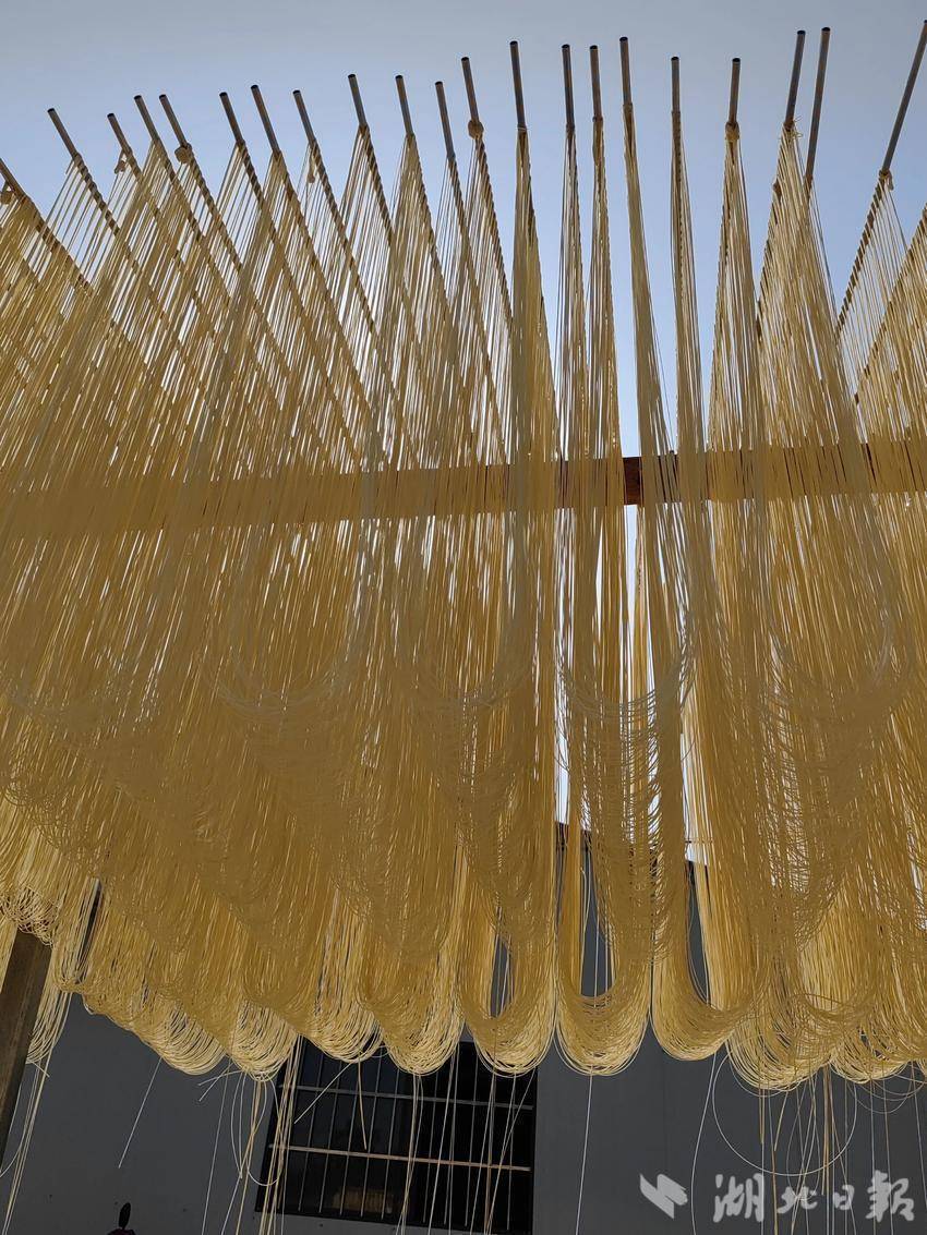 纵横交错的挂面架上,雪白的奎面层层叠叠,如珠帘一般打散了光影。制面师傅在其中来回穿行,影影绰绰中呈现着丰收的喜悦。