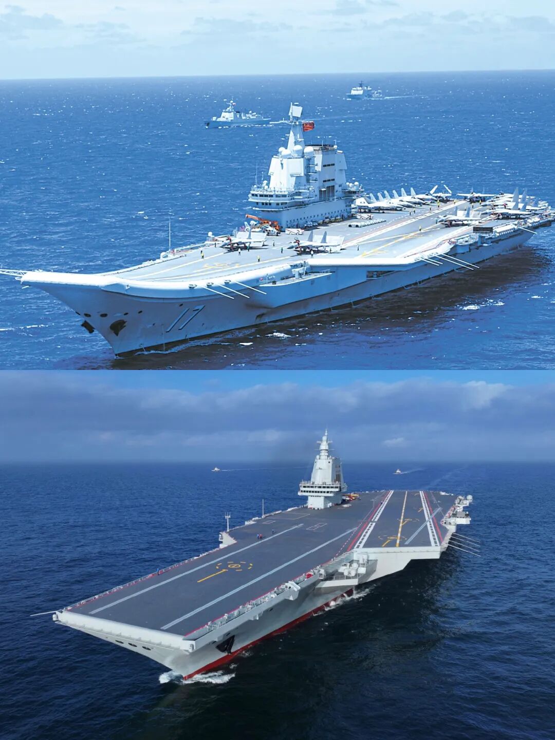 ||上图为山东舰,甲板向上翘起,下图为福建舰,电磁弹射起飞的甲板呈平直状态。